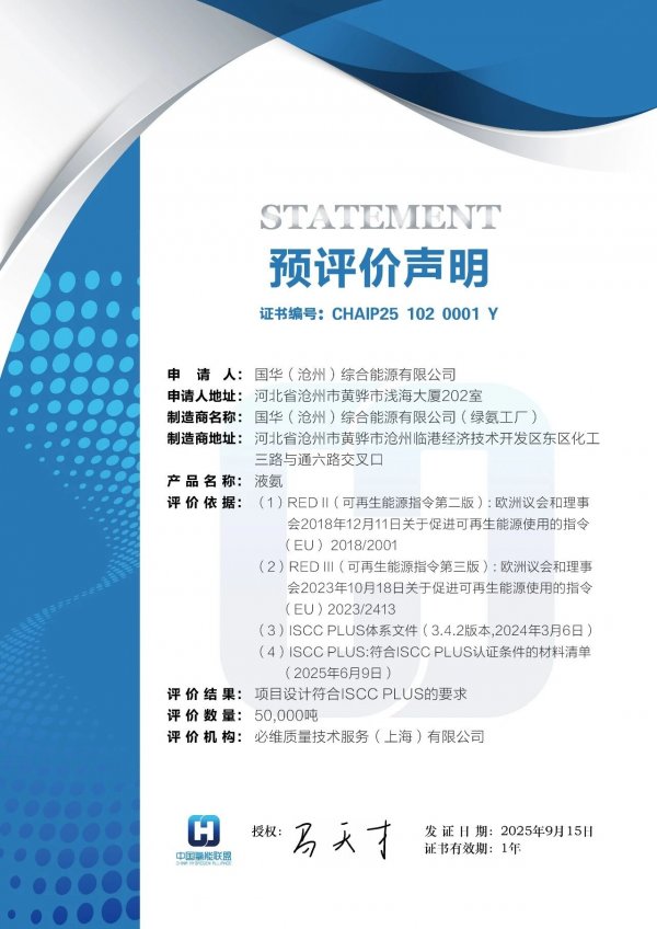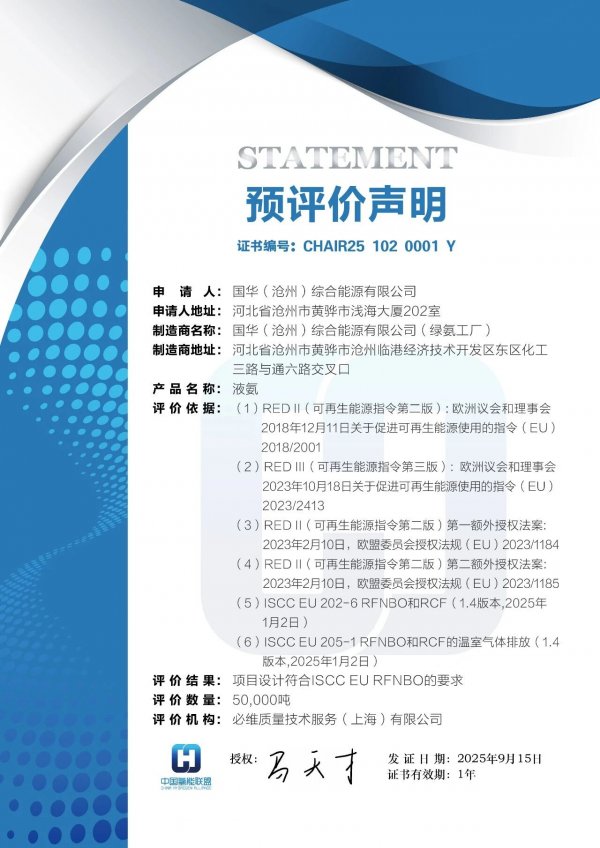 全流程碳足迹预评价工作由国华投资(氢能公司)河北分公司主导,委托国能氢创科技(北京)有限责任公司与世界知名第三方机构必维国际检验集团依据欧盟RED额外授权法案开展。对绿港氢城绿氨产品进行预评价,从电力符合性、全生命温室气体排放符合性及质量平衡等方面签发了符合性评估报告。结果表明,公司绿氨产品不仅满足由欧盟委员会定义非生物源可再生燃料体系(RFNBO适用欧盟市场)要求,也满足国际可持续发展和碳认证体系(ISCC PLUS适用欧盟以外市场)要求,是对项目绿色制氢和制氨工艺的高度认可,为创新绿氨生产路径提供了国能集团方案,也将为项目绿氨工厂的顺利投产消纳奠定坚实基础。