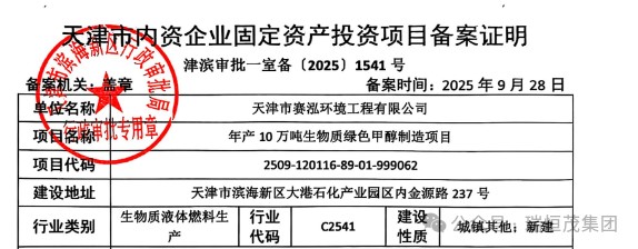 投资10.34亿!赛泓环境年产10万吨生物质绿色甲醇制造项目成功取得立项审批